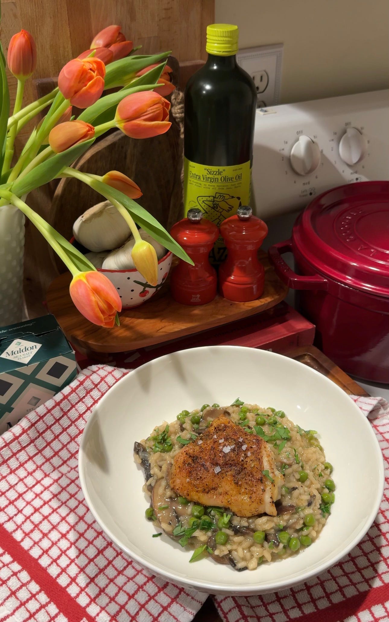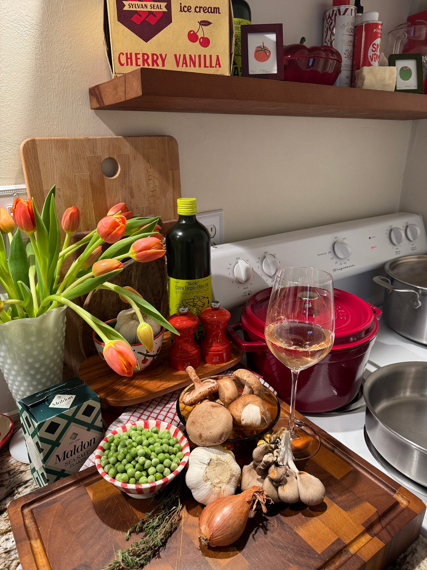 Turn off the heat & add the remaining butter. (If using frozen peas, add them at this point!) Taste & adjust seasoning if necessary.